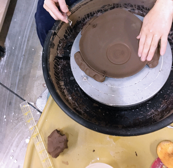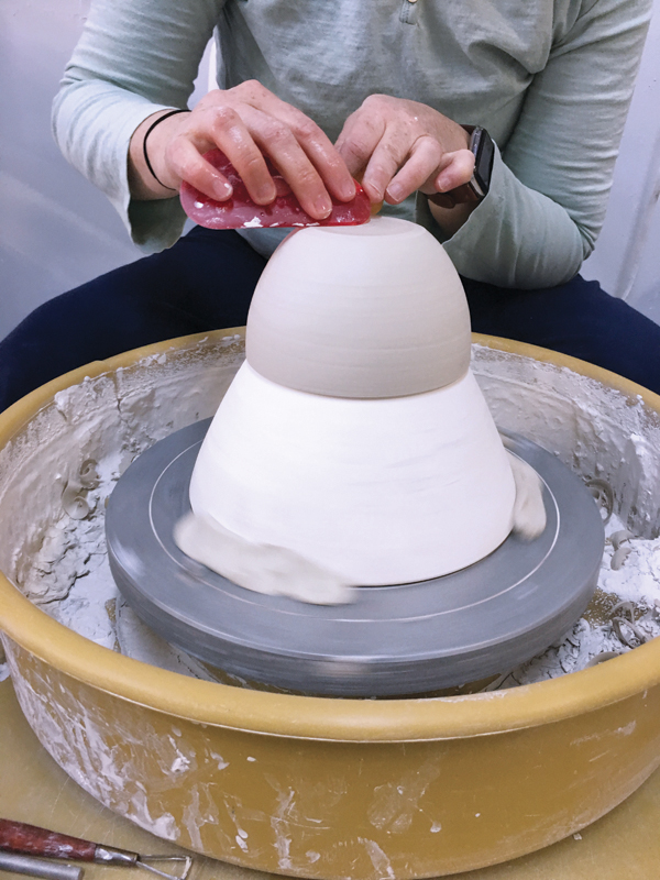 Using 1 pound of a different clay body (to achieve contrast), throw a simple bowl on the potter’s wheel (5). As soon as you finish throwing the bowl, alter the edge of the bowl’s rim by pulling any side with one finger (6). You can do this alteration on one spot of the edge or multiple spots to achieve different shapes.