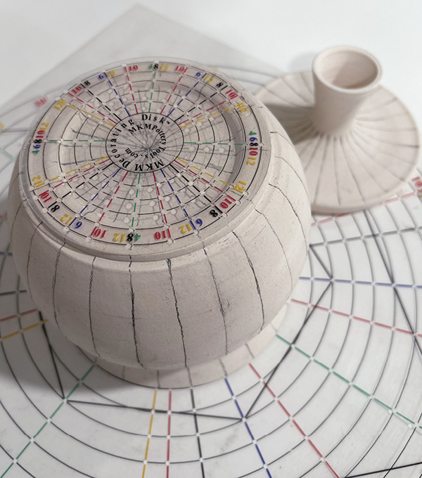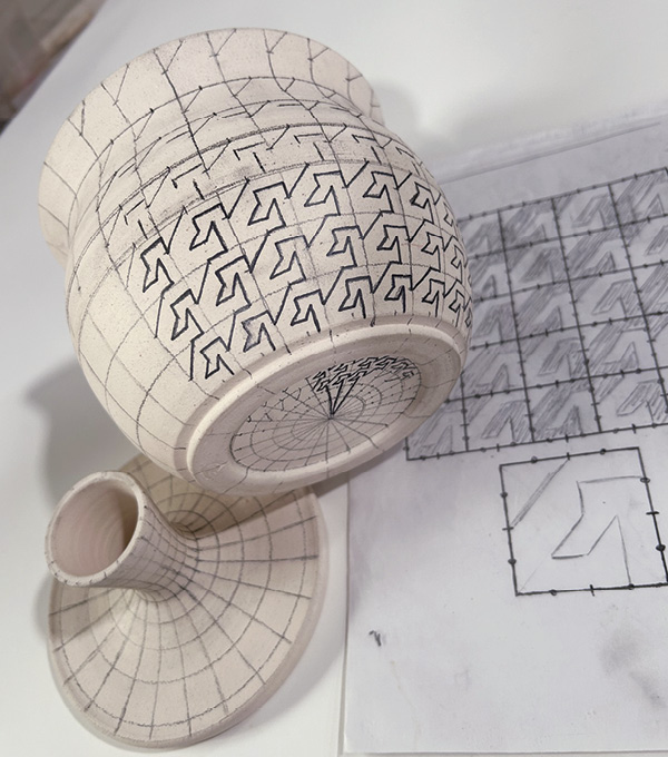 The smooth surface of a clay vessel calls me to adorn it. I hold a fascination with the way a loom creates complex patterns and symmetry possible from simple fiber with the pleasing effect of repetition found in modest quilts, tile designs, and ancient Islamic architecture. I alter these designs using digital software while observing patterns from history. Working with digital patterns makes it possible to observe and alter various color options simultaneously. These complex, hand-painted glaze surfaces trick the viewer into thinking they are machine-made. In a fast-paced society, the handmade object can still be appreciated.