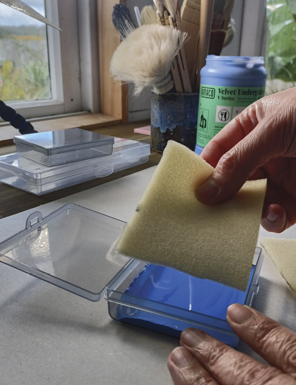 5 After adding the second layer of foam, press the foam into the underglaze with the end of a brush. 6 Once the foam is saturated with underglaze, it is ready to use.