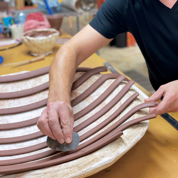 Begin by extruding the oval coils in a batch and set them next to the mold. Starting in the middle of the mold form, arrange the coils in parallel from the center out, with the shortest coils being reserved for the outer edges. After turning the mold 45°, extrude another batch and set them next to the mold. I want the coils to be arranged a similar distance apart from each other, so I use a ruler to space them out, then use it to mark the spacing for the perpendicular coils (1). Score and wet the attachment areas of the coils on the mold (2), then put the perpendicular coil back in place. Because the clay is fresh and soft, you only need to score one side. Subsequent attachments will secure the coils in place. Continuing this process for the remaining coils results in a second layer running perpendicular to the first, making a sort of checkerboard pattern of overlapping coils (3). Rolling a pony roller over all of the joints compresses and reinforces the attachments (4). Cut the coils to the edge of the mold, but do so loosely to achieve the rough look.