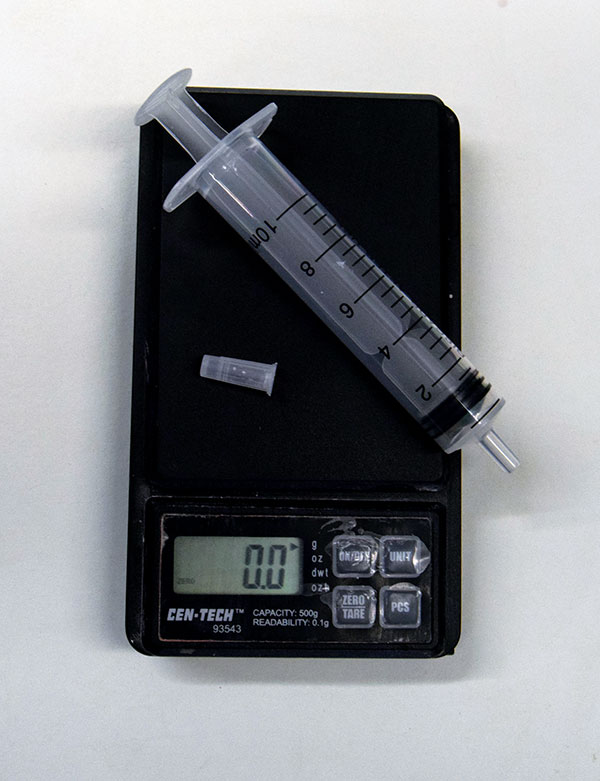 Start by stirring the glaze until it’s ready for use. Place the syringe, along with its cover, on the scale (1), then turn the scale on. Or, if you prefer, you can turn on the scale, place the syringe and its cover on the scale, then press the tare button to zero it out. For me, the first approach is easier.