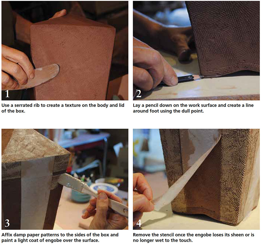 Excess clay bits are removed with a brush, then, using a soft plastic rib, she softens the hard edges of the serrated lines in a variegated, almost unintentional way to give the surface texture a distressed appearance. Using a pencil and a straightedge, she defines the feet from the ground plane with a line (figure 2) then does the same for the lid separation areas. Once these marks are complete, Lisa cuts four paper templates that will further define a center band on the sides of the box. After wetting them completely, she adheres them to the center of each side of the box with a sponge.
