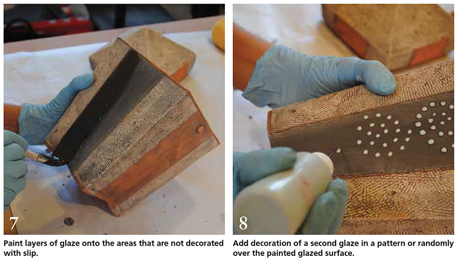 Two small semi-spherical “bosses” are added to indicate the correct positioning of the lid to the body. After drying, the piece is bisque fired to cone 06.The final decoration begins by applying a watered-down black stain. Wearing gloves, Lisa applies a watery coat of Amaco V-361 Black Velvet Underglaze with a brush to fill the surface texture (figure 5). After coating the entire exterior of the piece, she uses a closed-cell tile sponge and lots of water to remove any excess stain so that it remains only in the textured areas (figure 6).