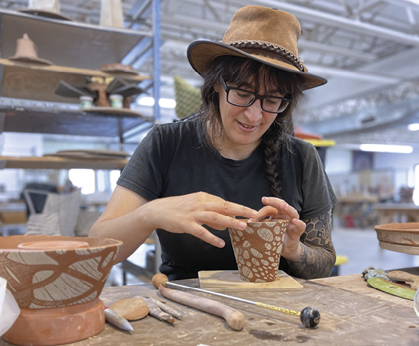 Visual illusions like this are strong components of Braha’s ceramic vessels, where line patterns are intentionally manipulated to create a sense of foreground and background. One of her pieces titled Vantage Point was juried into Japan’s International Ceramic Festival Mino ‘24—the world’s largest ceramics triennial competition—receiving an honorable mention in the ceramics design category, and finalist position in the three top awards in the ceramics design category. This minimalist piece unexpectedly resolves in a myriad of ways, depending on the viewer’s vantage point. Braha says her intention was to create a piece that reflected the “subjective and multifaceted aspects of reality.”